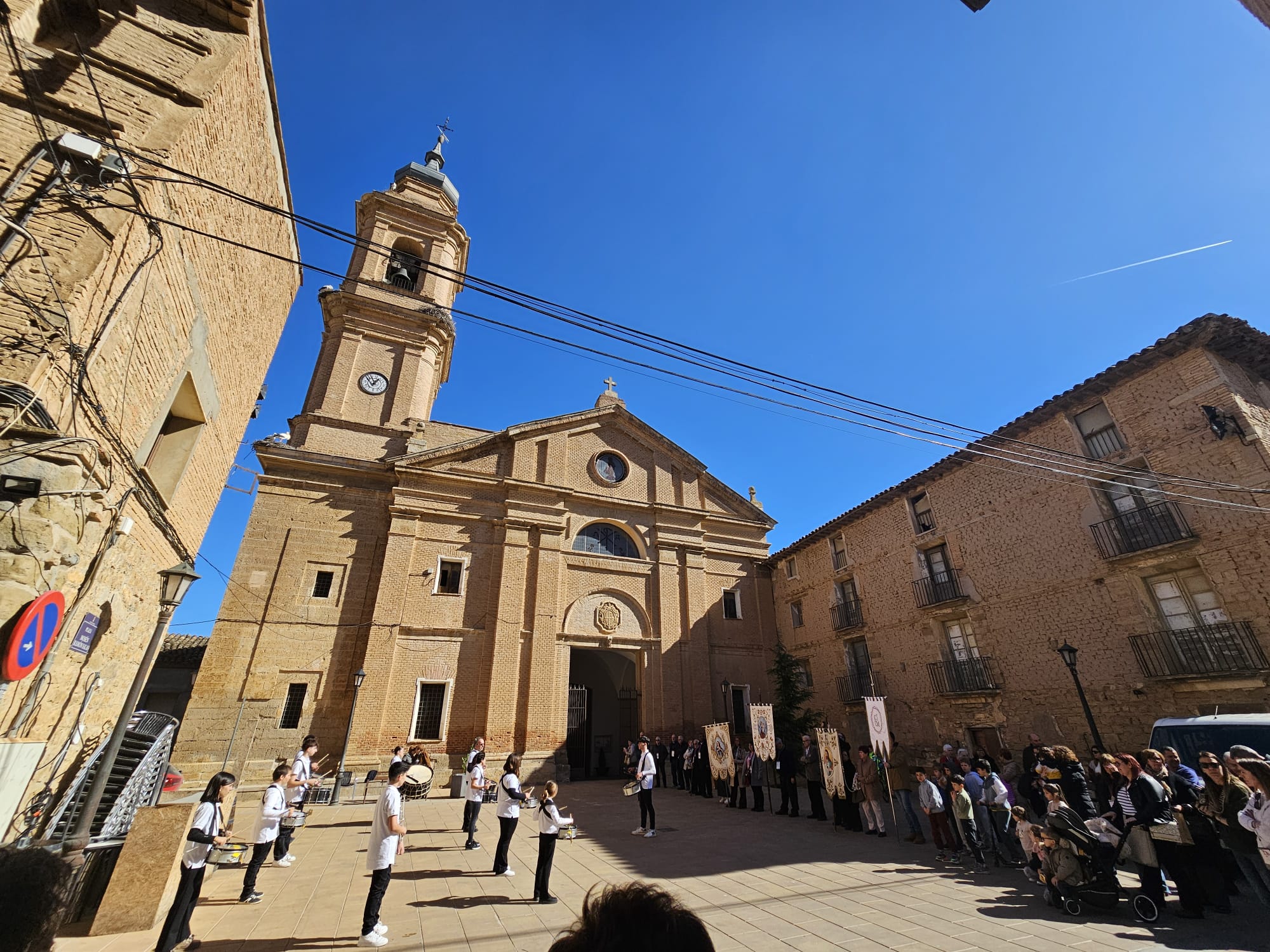 Antes de la celebración de la eucaristía, la banda de tambores y bombos de la Cofradía del Santo Cristo de Alcolea de Cinca ofreció una actuación a las puertas de la iglesia de San Juan Bautista, llenando de solemnidad y emoción los instantes previos a la Santa Misa.