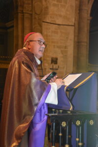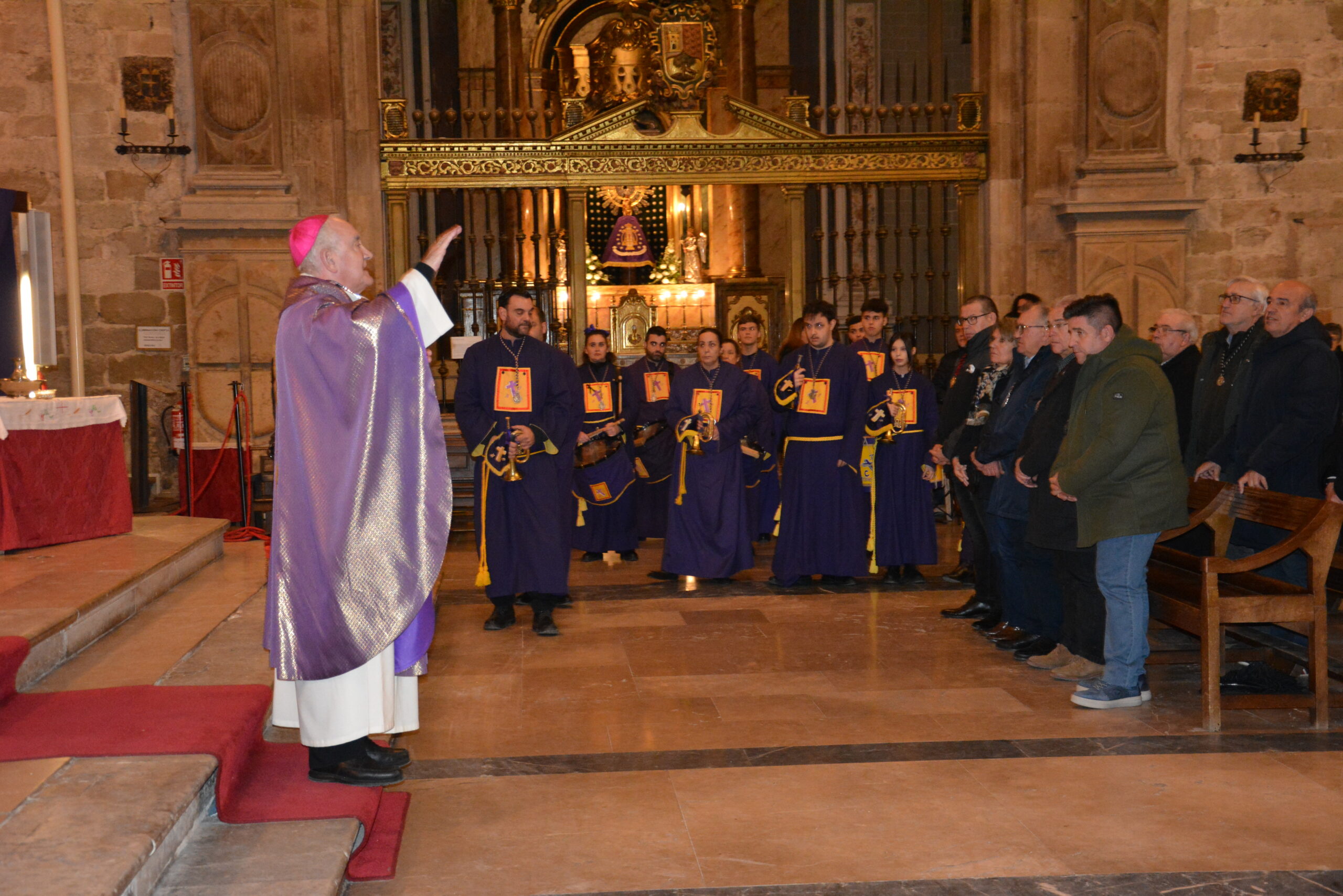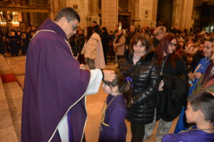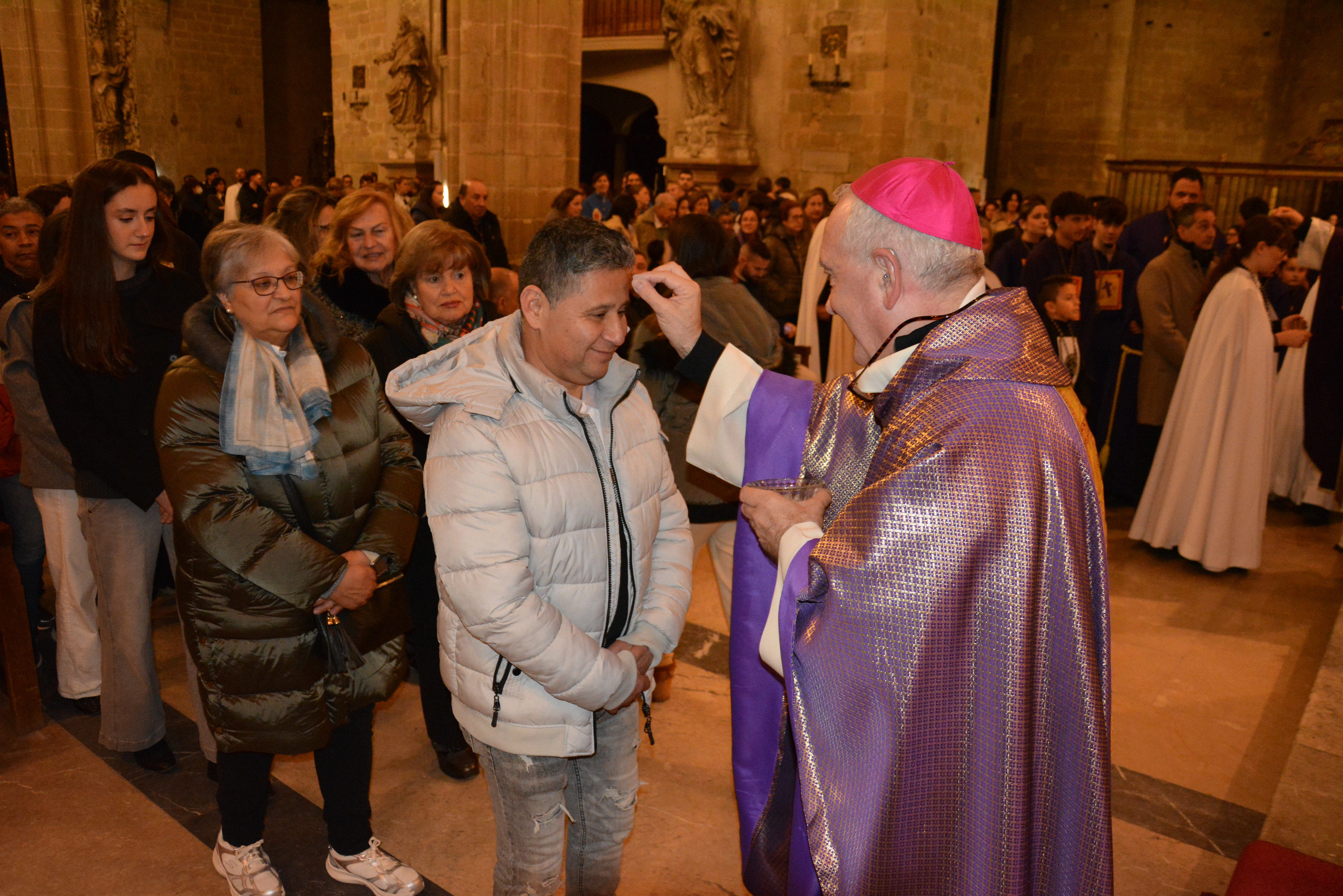 La celebración comenzó con el toque del piquete de la Cofradía de Nuestro Padre Jesús Nazareno por el pasillo central, recordando a los asistentes el inicio de los cuarenta días de preparación para la Pascua. Tras el saludo inicial del Obispo, Asún Bardají pronunció la monición de entrada, destacando que la Iglesia ofrece en este día un rito de reconciliación que, pese a sus antiguas resonancias, siempre resulta nuevo para el creyente.