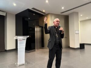 Los asistentes escucharon los testimonios de Julia Baldellou y Pili Cortes, voluntarias de la Hospitalidad Diocesana de Nuestra Señora de Lourdes, que compartieron su experiencia personal y compromiso en el acompañamiento a enfermos y personas mayores. «A Lourdes no se va, se vuelve», subrayó Julia, cuya implicación en la Hospitalidad se ha transformado a lo largo de los años hasta ser hoy la secretaria de una entidad que representa «las manos de la Virgen».