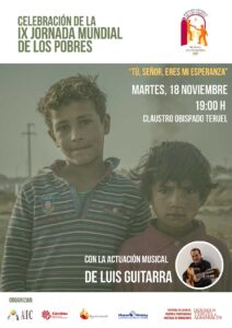 El próximo martes 18 de noviembre, a las 19:00 horas, se celebrará en el claustro del obispado de Teruel la IX Jornada Mundial de los Pobres, con el lema «Tú, Señor, eres mi esperanza» (Sal 71,5).