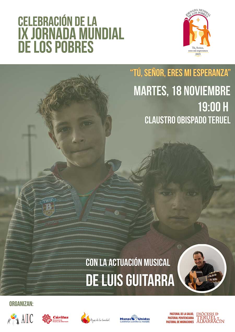 La celebración contará con la actuación musical de Luis Guitarra y está organizada por las entidades solidarias de la diócesis: Asociación Nacional de Caridad San Vicente de Paul (AIC), Cáritas Diocesana de Teruel Albarracín, Hijas de la Caridad, Manos Unidas de Teruel, Pastoral de Migraciones de Teruel Albarracín, Pastoral Penitenciaria de Teruel Albarracín y Pastoral de la Salud de Teruel Albarracín. Será un momento para la reflexión, la música, la cercanía y la solidaridad con los más desfavorecidos en nuestra comunidad.