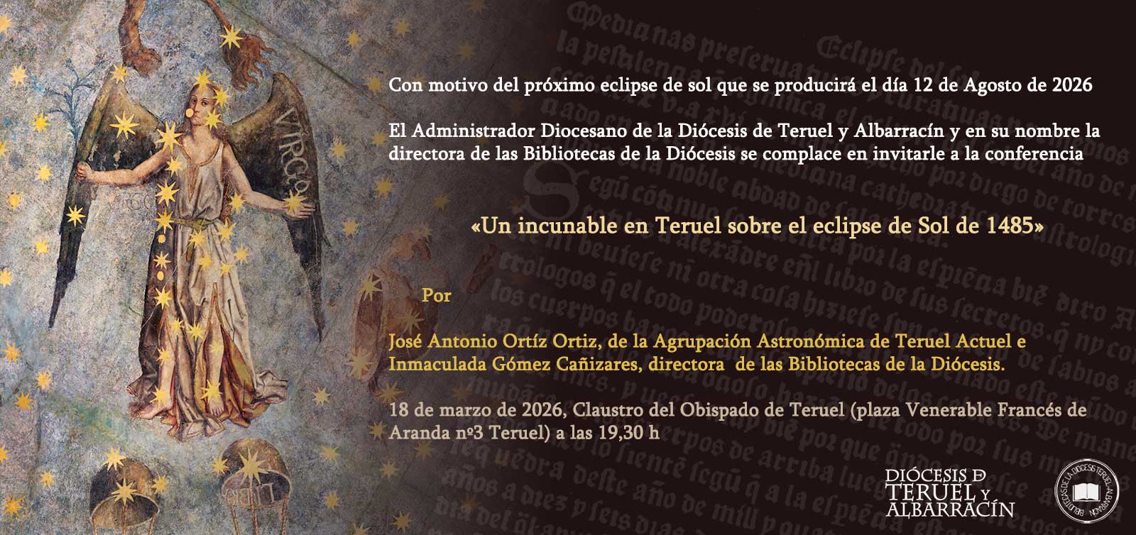 El próximo día 18 de marzo de 2026, se presenta la conferencia “Un incunable en Teruel sobre el eclipse de Sol de 1485”. Tendrá lugar en el Claustro del Obispado de Teruel a las 19,30 h. por José Antonio Ortíz Ortíz e Inmaculada Gómez Cañizares.