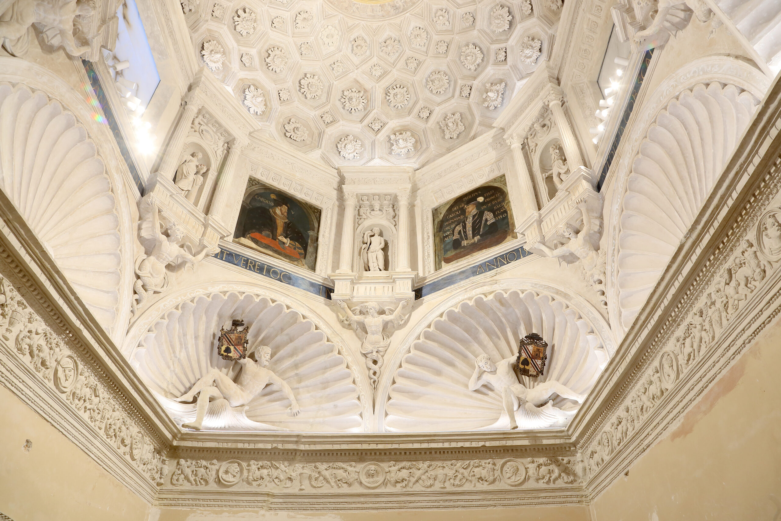 La restauración de la cúpula del Palacio Episcopal de Tarazona ha deparado un hallazgo inesperado: dos frisos renacentistas del siglo XVI que habían permanecido ocultos durante siglos bajo capas de cal. El descubrimiento se produjo durante las obras ejecutadas por la Fundación Tarazona Monumental, que durante nueve meses ha trabajado en el sellado de grietas estructurales, la limpieza de yeserías y esculturas, y la reintegración cromática de pinturas murales.