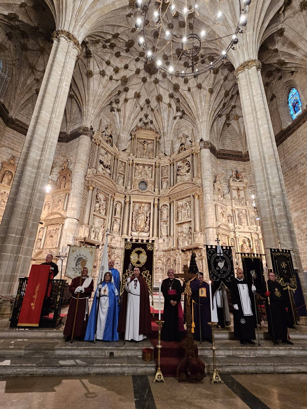 Tras la oración comunitaria en la Catedral, presidida por el obispo, Mons. Ángel Pérez Pueyo, y realizada por el presidente del Santo Sepulcro, Jorge Belloc, el golpe en la puerta de los romanos de la Cofradía de la Merced anunció el comienzo de un desfile procesional que lleva la catequesis a las calles.