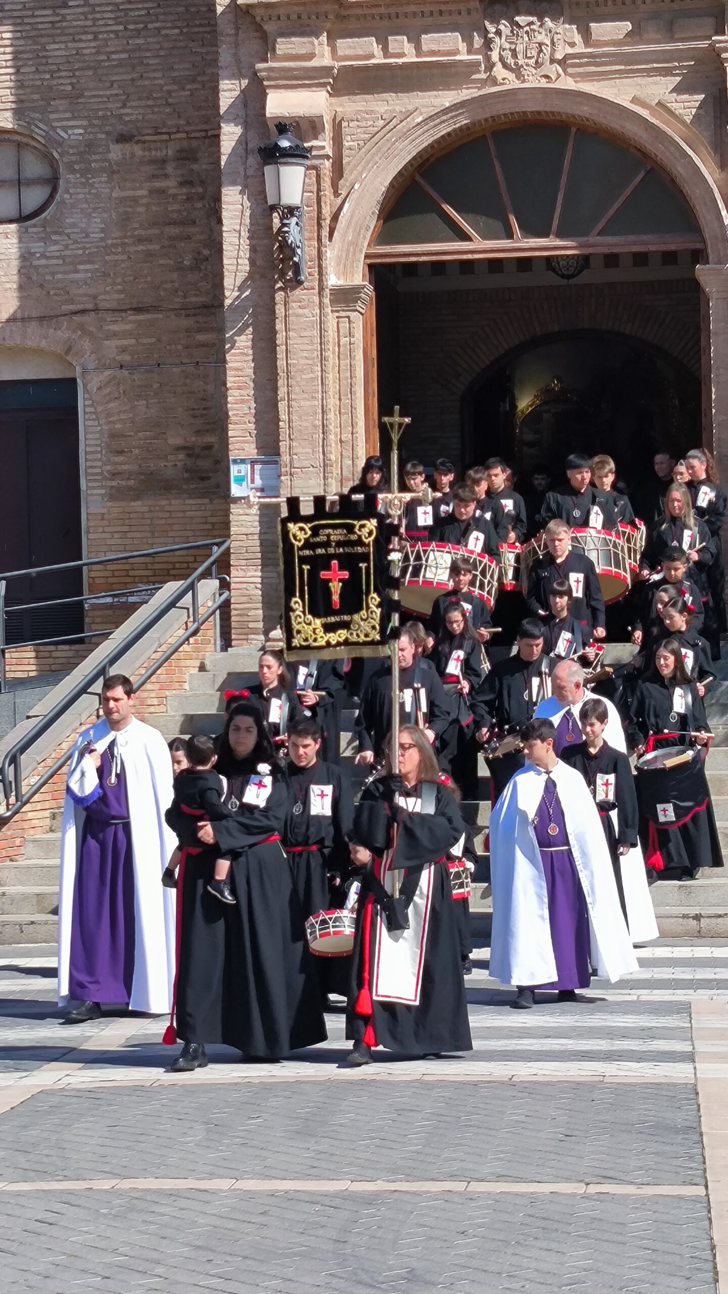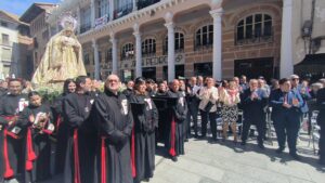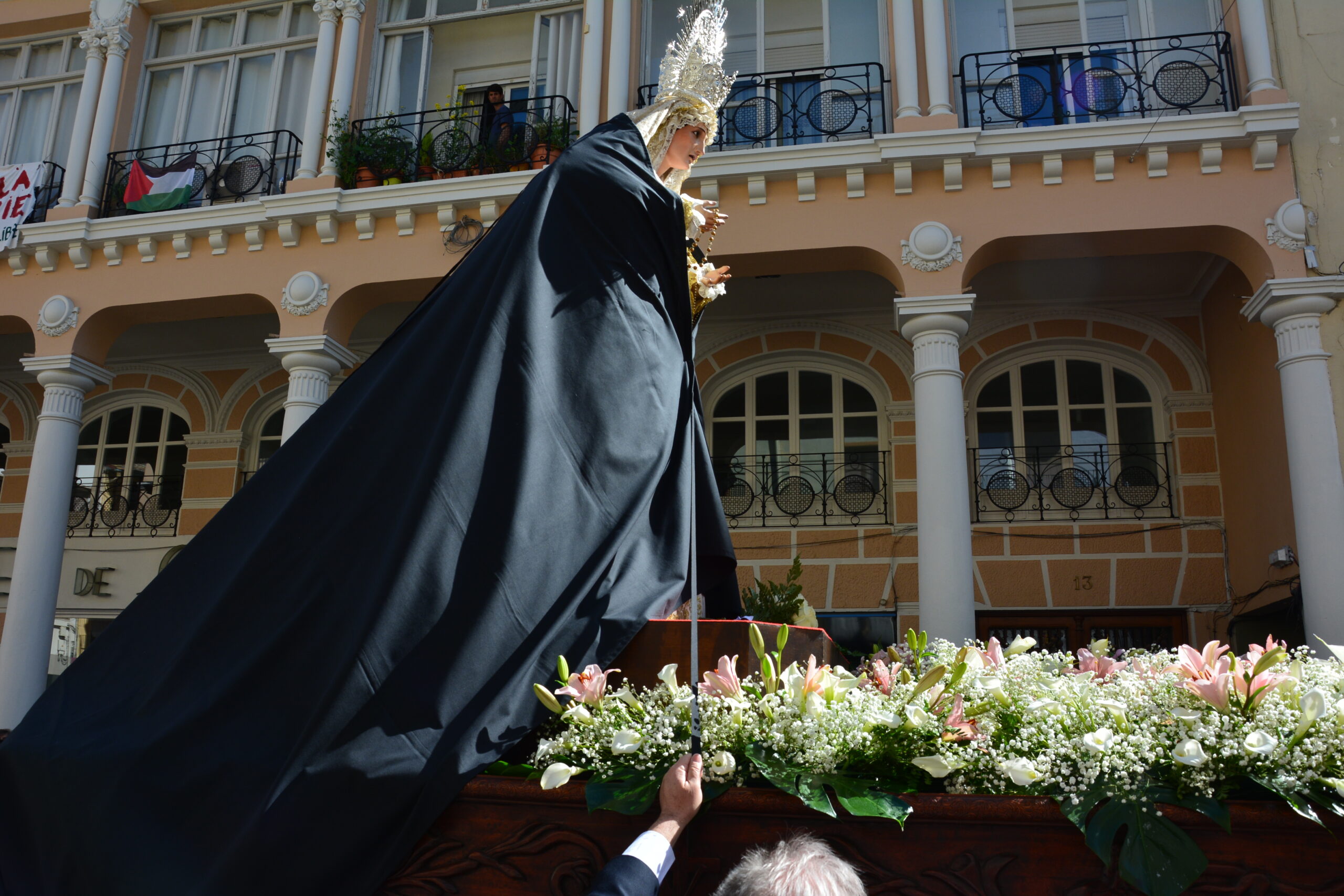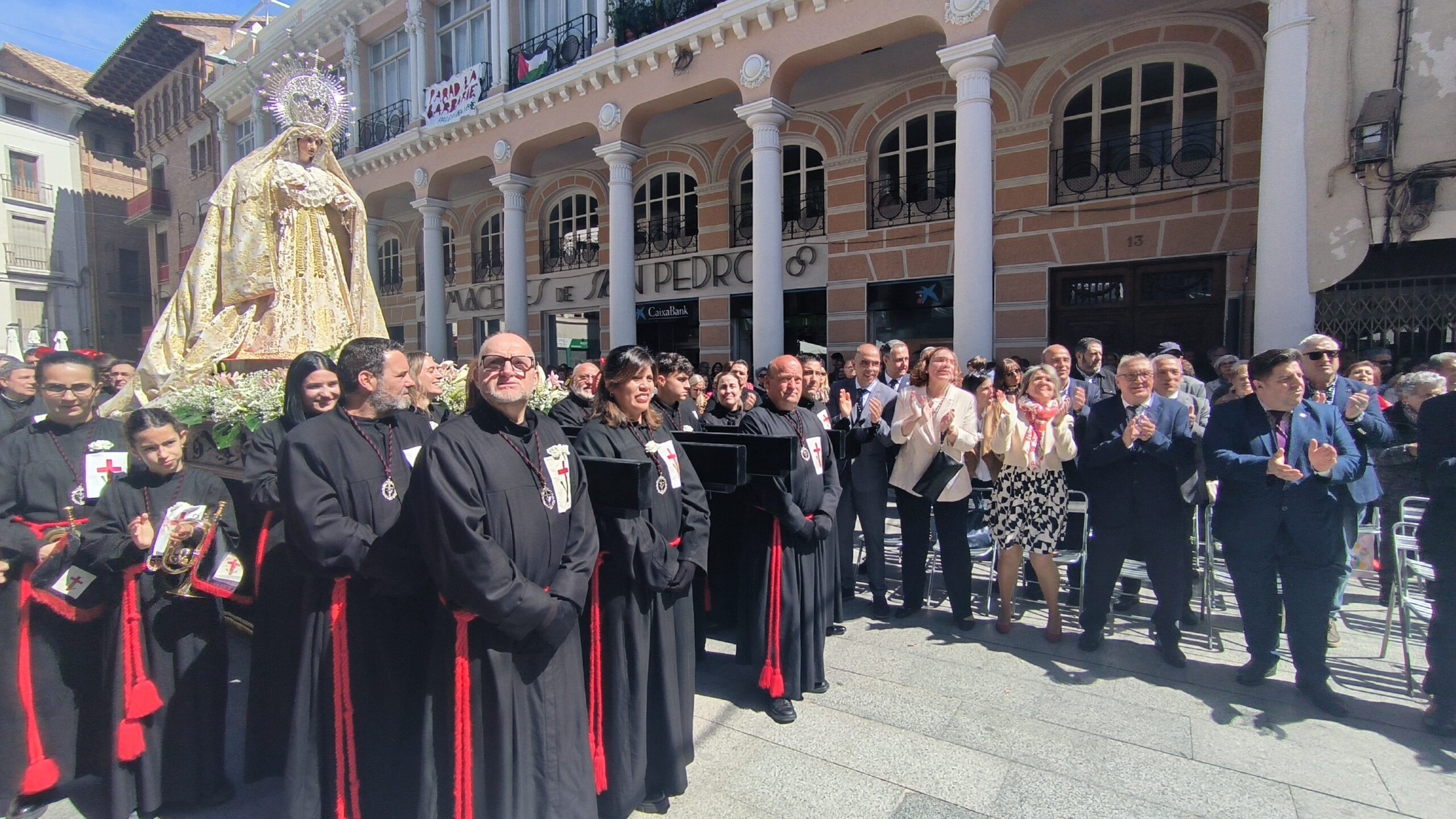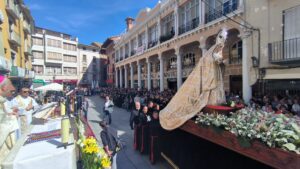 Por distintos itinerarios, ambos han alcanzado la Plaza del Mercado, donde el Resucitado se ha encontrado con Nuestra Señora de la Soledad. Ante la mirada de los presentes, la Virgen se ja despojado de sus ropajes de luto para lucir el blanco de la alegría, simbolizando la victoria sobre la muerte.