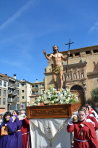 En la iglesia de San Francisco, la sección de instrumentos de la Hermandad ha marcado este año el paso del Cristo Resucitado, portado a hombros por representantes de todas las cofradías. Tras él, los presidentes de las cofradías, sacerdotes de la Unidad Pastoral y el obispo, Mons. Ángel Pérez Pueyo, portado una representación de medallas cofrades. Cuando ya había pasado el puente peatonal, las puertas del templo se abrieron de nuevo para dar paso a la Virgen, con la sección de instrumentos de su cofradía, el Santo Sepulcro.