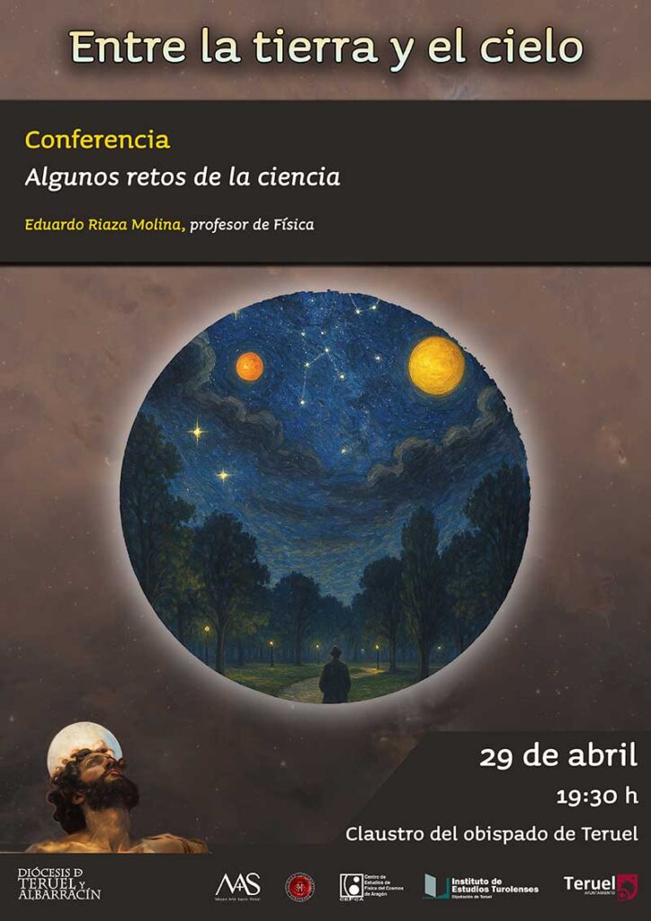 El próximo acto dentro del ciclo «Entre la tierra y el cielo» será el próximo miércoles, 29 de abril, con la conferencia «Algunos retos de la ciencia» en el claustro del obispado de Teruel a las 19:30 horas.