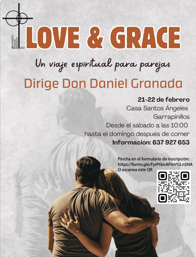 Ante la necesidad de que los matrimonios puedan disponer de espacios propios donde retirarse y orar de forma conjunta durante un fin de semana, surgen distintas propuestas dentro de la Archidiócesis de Zaragoza. Una de ellas son los ejercicios conyugales del Movimiento Familiar Cristiano (MFC) cuya próxima edición tendrá lugar del 21 al 22 de febrero en la Casa Santos Ángeles (Garrapinillos). Bajo el título » Love and Grace», estarán dirigidos por el canónigo  y párroco de la Seo, Daniel Granada. Más información en el teléfono 637 927 653.