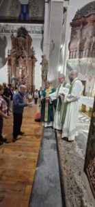 La Eucaristía fue presidida por el obispo diocesano, Mons. Vicente Rebollo, quien durante la celebración realizó el rito de envío de los catequistas y entregó la missio canonica a los profesores de religión. Este gesto expresa el reconocimiento oficial de la Iglesia a su labor evangelizadora y educativa, y les anima a desempeñarla con fidelidad, entrega y alegría.