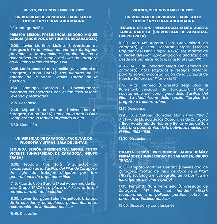 La Universidad de Zaragoza, en colaboración con el Cabildo de Zaragoza y otras instituciones, organiza las Segundas Jornadas «Concluyendo el Pilar». Este evento tendrá lugar los días jueves 20 y viernes 21 de noviembre de 2025 en la Facultad de Filosofía y Letras (Aula Magna y Sala de Juntas) de la Universidad de Zaragoza.