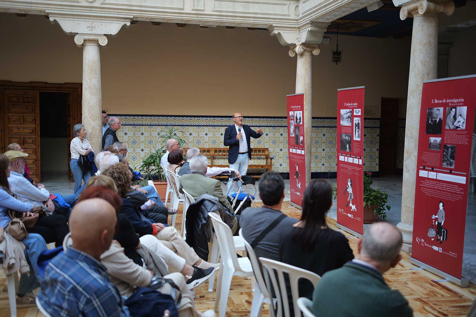 El acto de presentación corrió a cargo de Eduardo Riaza Molina, profesor de Física y coordinador de la exposición, quien fue introducido por Rosaura Albero. Durante su intervención, Albero destacó la trayectoria de Riaza como estudioso de la figura de Lemaître, subrayando su biografía La historia del comienzo, en la que acerca de forma amena la vida del científico y sacerdote belga, «auténtico coloso de la ciencia moderna».