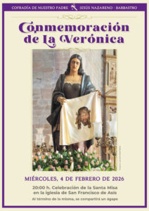 La Cofradía de Nuestro Padre Jesús Nazareno de Barbastro consolida en la agenda cofrade la cita que conmemora La Verónica. El miércoles 4 de febrero se celebrará una misa las 8 de la tarde, en la iglesia de San Francisco de Asís.