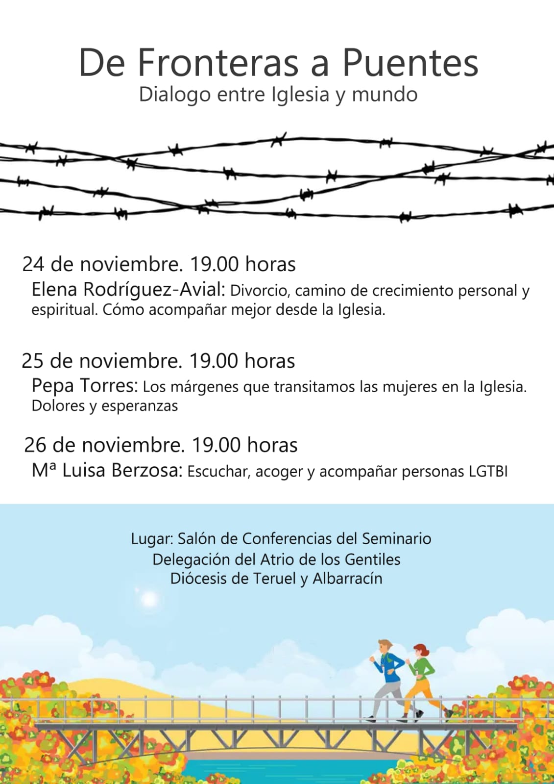 La Delegación del Atrio de los Gentiles de la diócesis de Teruel y Albarracín ha organizado un nuevo ciclo de conferencias bajo el lema “De Fronteras a Puentes. Diálogo entre Iglesia y mundo”, una propuesta pensada para abrir espacios de reflexión sobre realidades actuales que interpelan a la comunidad cristiana. Las sesiones tendrán lugar los días 24, 25 y 26 de noviembre, a las 19:00 horas, en el Salón de Conferencias del Seminario de Teruel.