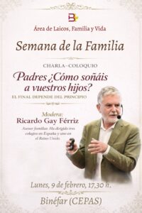 • Lunes, 9 de febrero (Binéfar): La semana arranca a las 17:30 h en el CEPAS con la charla-coloquio «Padres, ¿cómo soñáis a vuestros hijos? El final depende del principio». Ricardo Gay Férriz, reconocido asesor familiar con amplia trayectoria internacional en la dirección de centros educativos, conducirá la sesión.