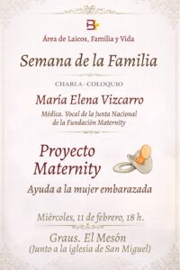 • Miércoles, 11 de febrero (Graus): El foco se trasladará a la ayuda a la maternidad. A las 18:00 h, en El Mesón (junto a la iglesia de San Miguel), la doctora María Elena Vizcarro, vocal de la Junta Nacional de la Fundación Maternity, dará a conocer el «Proyecto Maternity: Ayuda a la mujer embarazada».