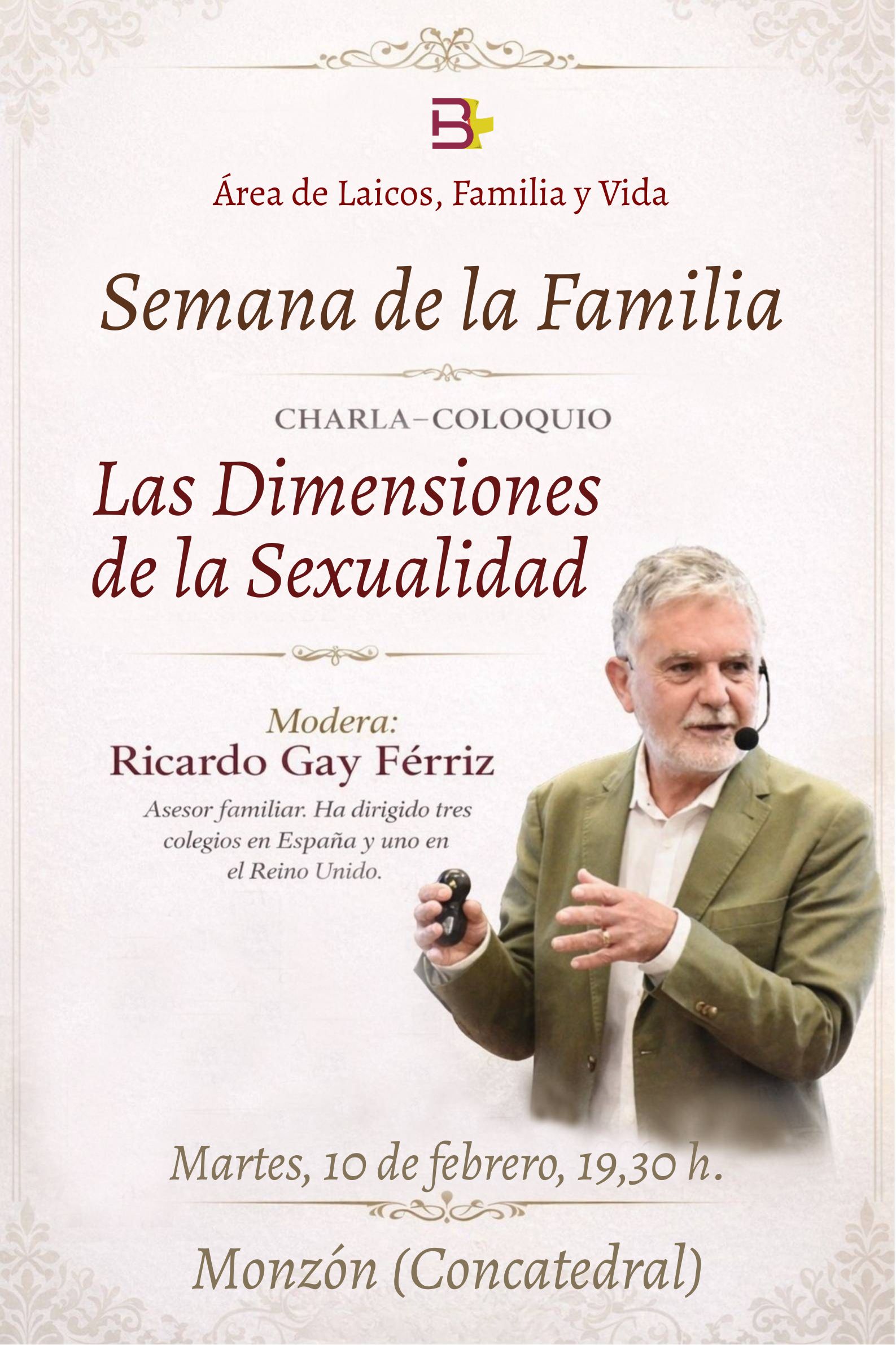 • Martes, 10 de febrero (Monzón): Ricardo Gay Férriz repetirá como moderador en la Concatedral de Monzón a las 19:30 h, esta vez para abordar un tema fundamental: «Las dimensiones de la sexualidad».