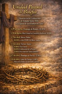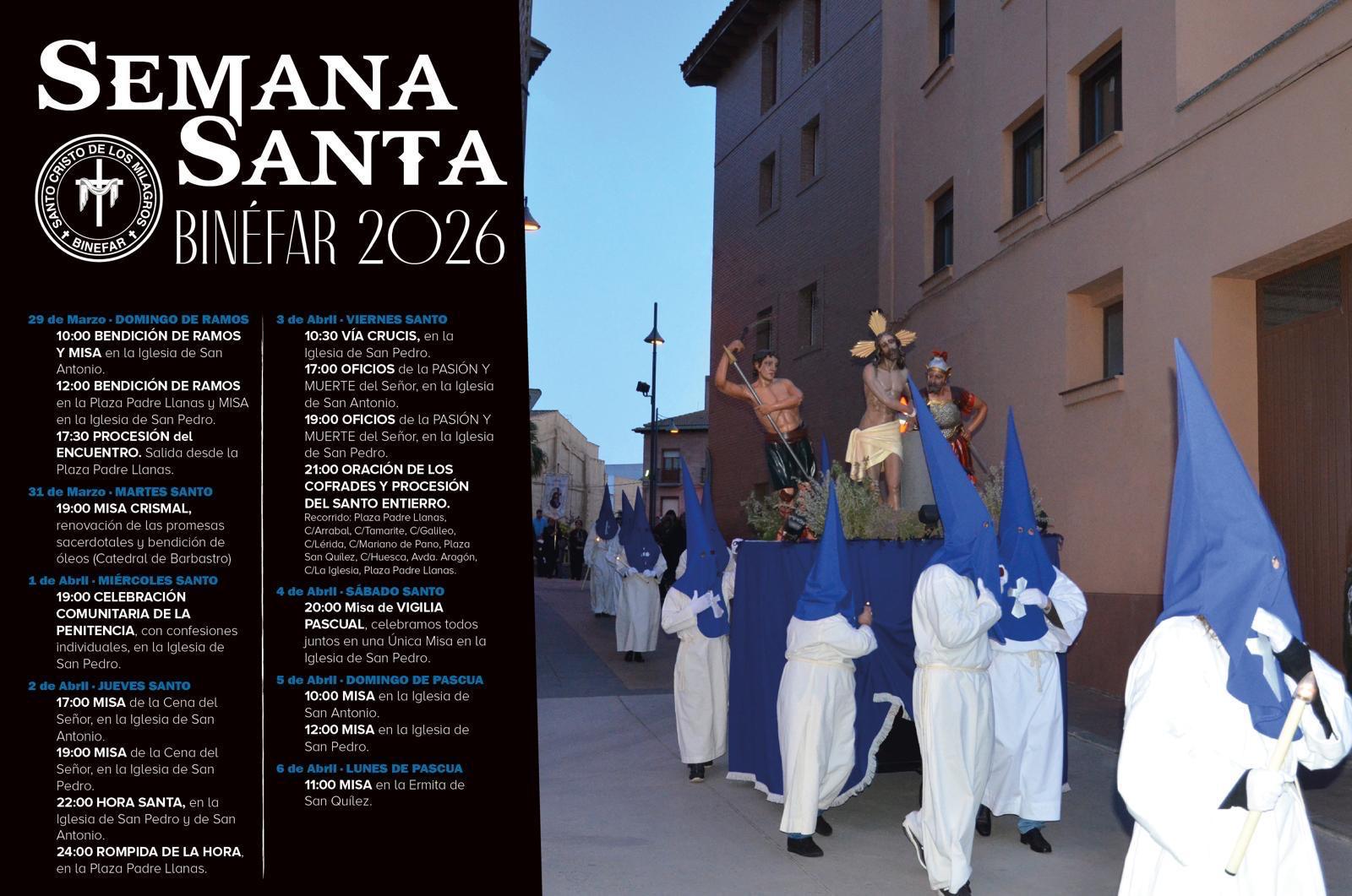 Los cofrades y fieles de Binéfar se preparan a vivir las procesiones y actos litúrgicos de la Semana Santa, que comenzarán el domingo 22 con la bendición de Ramos y la Procesión del Encuentro -que se recuperó hace quince años- y finalizarán con la celebración, en la Sierra de San Quílez, el Lunes de Pascua.