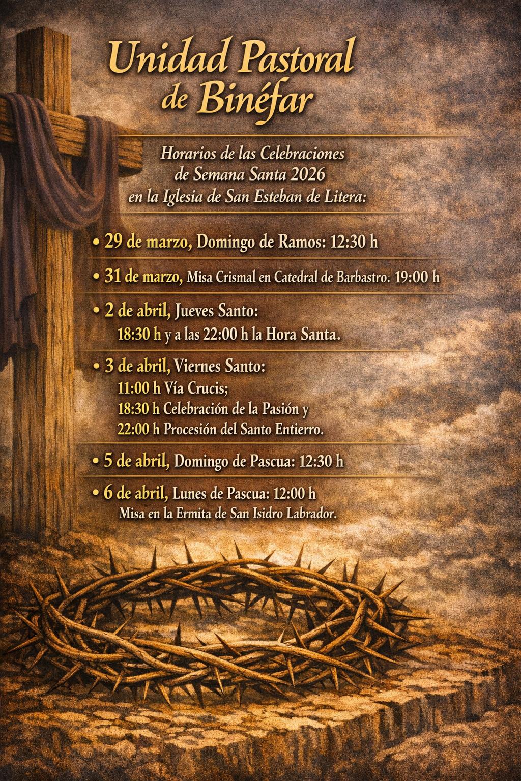 La programación de la Unidad Pastoral abarca también las celebraciones coordinadas en la iglesia de Esplús y la iglesia de San Esteban de Litera, reforzando el carácter comunitario de estas fechas en toda la zona.