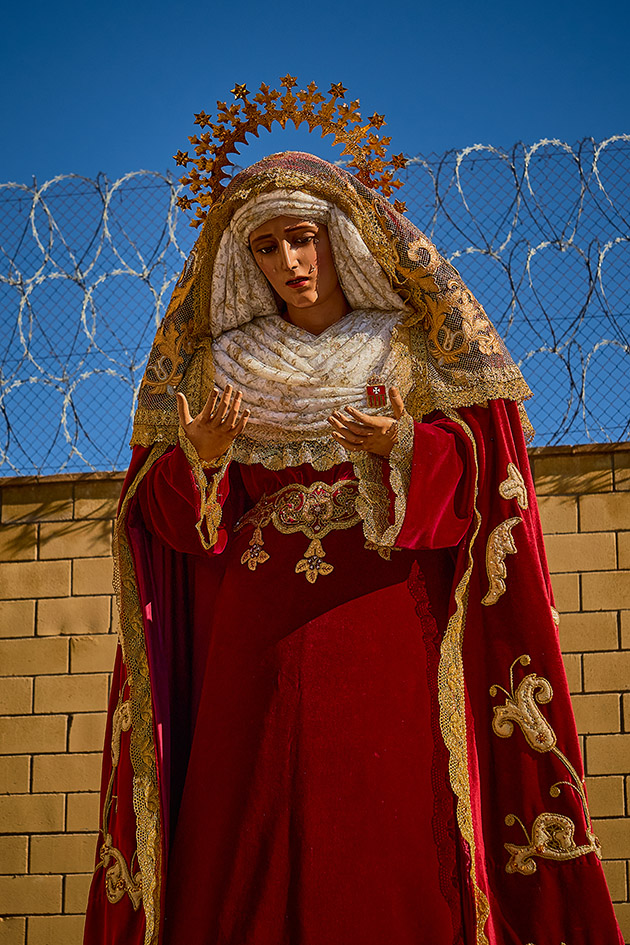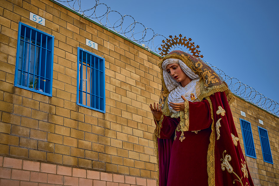 La Virgen, imponente en sus andas, recorrió los módulos llenando los pasillos de un silencio sagrado que solo rompía el golpe seco de los tambores. Los internos, asomados a las ventanas, veían pasar a la Madre. En medio del patio, la voz de un preso se quebró en una saeta valiente, un grito de dolor y esperanza dirigido directamente a los ojos de la Virgen.