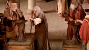 En el evangelio de Lucas este relato viene a continuación de una controversia de Jesús con los maestros de Israel que buscaban los primeros puestos y devoraban la hacienda de las viudas. Jesús observa cómo los ricos echan dinero en el arca del templo. Cuanto más sonaban las monedas más fuertes eran los aplausos de la gente. Pero la mirada de Jesús se detiene en una pobre viuda que, llevando dos monedas, echa las dos y se queda sin nada. Podría haberse quedado una y tener asegurado el pan del día siguiente. Pero la viuda se queda sin nada: sin el sustento de hoy y sin el pan del mañana. Al vaciarse de todo lo que tiene, pone el presente y el futuro en las manos de Dios. No da de lo que le sobra sino de lo que necesita para vivir. Ha depositado sus monedas en el cepillo de las ofrendas para el sacrificio de “holocausto”. Y en esta clase de sacrificios, como indica la palabra, se quemaba todo. Ella es de Dios y le entrega a Dios todo lo que tiene y todo lo que es. Sólo Dios puede crear, es decir, sacar algo de la nada. Y, en el orden espiritual, lo mismo. Dios llena al que está vacío, enriquece al que es pobre, y con nuestra nada, sabe trabajar muy bien y hacer cosas maravillosas. Como sucedió con su madre que hizo con ella cosas admirables porque se fijó en su pequeñez.