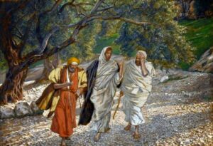 Aquel mismo día iban dos de ellos a un pueblo llamado Emaús, que distaba sesenta estadios de Jerusalén, y conversaban entre sí sobre todo lo que había pasado. Y sucedió que, mientras ellos conversaban y discutían, el mismo Jesús se acercó y siguió con ellos; pero sus ojos estaban retenidos para que no le conocieran. Él les dijo: «¿De qué discutís entre vosotros mientras vais andando?» Ellos se pararon con aire entristecido. Uno de ellos llamado Cleofás le respondió: «¿Eres tú el único residente en Jerusalén que no sabe las cosas que estos días han pasado en ella?» Él les dijo: «¿Qué cosas?» Ellos le dijeron: «Lo de Jesús el Nazareno, que fue un profeta poderoso en obras y palabras delante de Dios y de todo el pueblo; cómo nuestros sumos sacerdotes y magistrados le condenaron a muerte y le crucificaron. Nosotros esperábamos que sería él el que iba a librar a Israel; pero, con todas estas cosas, llevamos ya tres días desde que esto pasó. El caso es que algunas mujeres de las nuestras nos han sobresaltado, porque fueron de madrugada al sepulcro, y, al no hallar su cuerpo, vinieron diciendo que hasta habían visto una aparición de ángeles, que decían que él vivía. Fueron también algunos de los nuestros al sepulcro y lo hallaron tal como las mujeres habían dicho, pero a él no le vieron». Él les dijo: «¡Oh insensatos y tardos de corazón para creer todo lo que dijeron los profetas! ¿No era necesario que el Cristo padeciera eso y entrara así en su gloria?» Y, empezando por Moisés y continuando por todos los profetas, les explicó lo que había sobre él en todas las Escrituras. Al acercarse al pueblo a donde iban, Él hizo ademán de seguir adelante. Pero ellos le forzaron diciéndole: «Quédate con nosotros, porque atardece y el día ya ha declinado». Y entró a quedarse con ellos. Y sucedió que, cuando se puso a la mesa con ellos, tomó el pan, pronunció la bendición, lo partió y se lo iba dando. Entonces se les abrieron los ojos y le reconocieron, pero él desapareció de su lado. Se dijeron uno a otro: «¿No estaba ardiendo nuestro corazón dentro de nosotros cuando nos hablaba en el camino y nos explicaba las Escrituras?» Y, levantándose al momento, se volvieron a Jerusalén y encontraron reunidos a los Once y a los que estaban con ellos, que decían: «¡Es verdad! ¡El Señor ha resucitado y se ha aparecido a Simón!» Ellos, por su parte, contaron lo que había pasado en el camino y cómo le habían conocido en la fracción del pan.