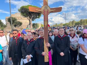 Durante estos días, los peregrinos han atravesado las cuatro puertas santas: San Pablo Extramuros, Santa María la Mayor, San Juan de Letrán y San Pedro. El acceso a esta última se realizó por la Via della Conciliazione, en una marcha simbólica encabezada por el obispo de Tarazona, Mons. Vicente Rebollo, quien portó la Cruz del Peregrino como signo de guía espiritual.