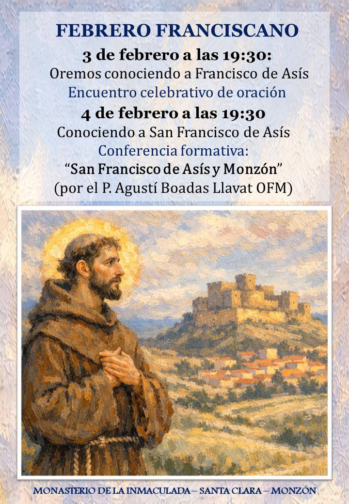 En el marco de este año jubilar, el Monasterio de las Hermanas Pobres de Santa Clara de Monzón ha organizado dos actos este mes de febrero, invitando a toda la comunidad a profundizar en la espiritualidad del santo. El martes, 3 de febrero, se ha programado un encuentro celebrativo que, con el nombre «Oremos conociendo a Francisco de Asís», propone una tarde de oración comunitaria. La segunda convocatoria, el miércoles 4, llega con la conferencia titulada «San Francisco de Asís y Monzón», a cargo del P. Agustí Boadas Llavat, OFM.