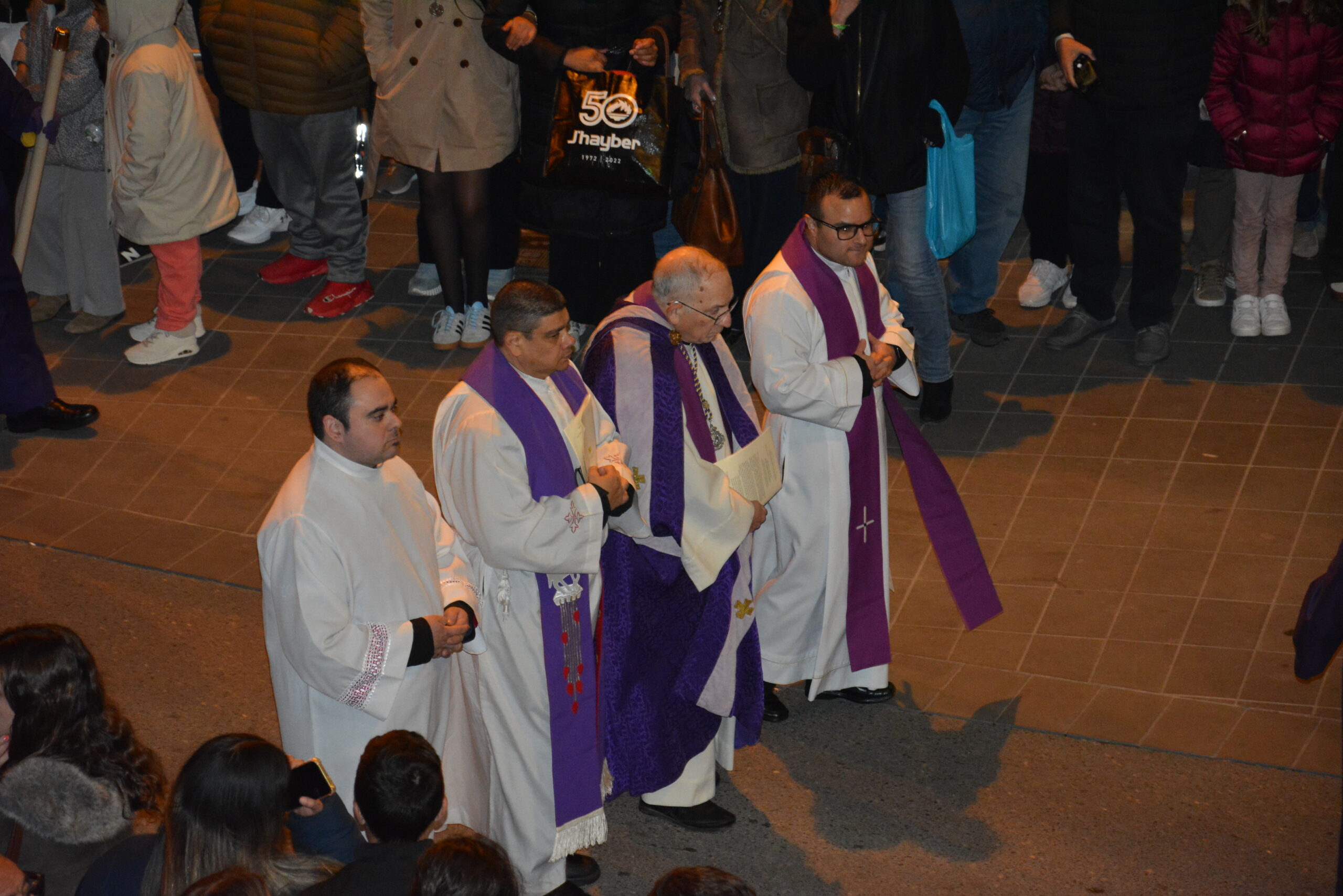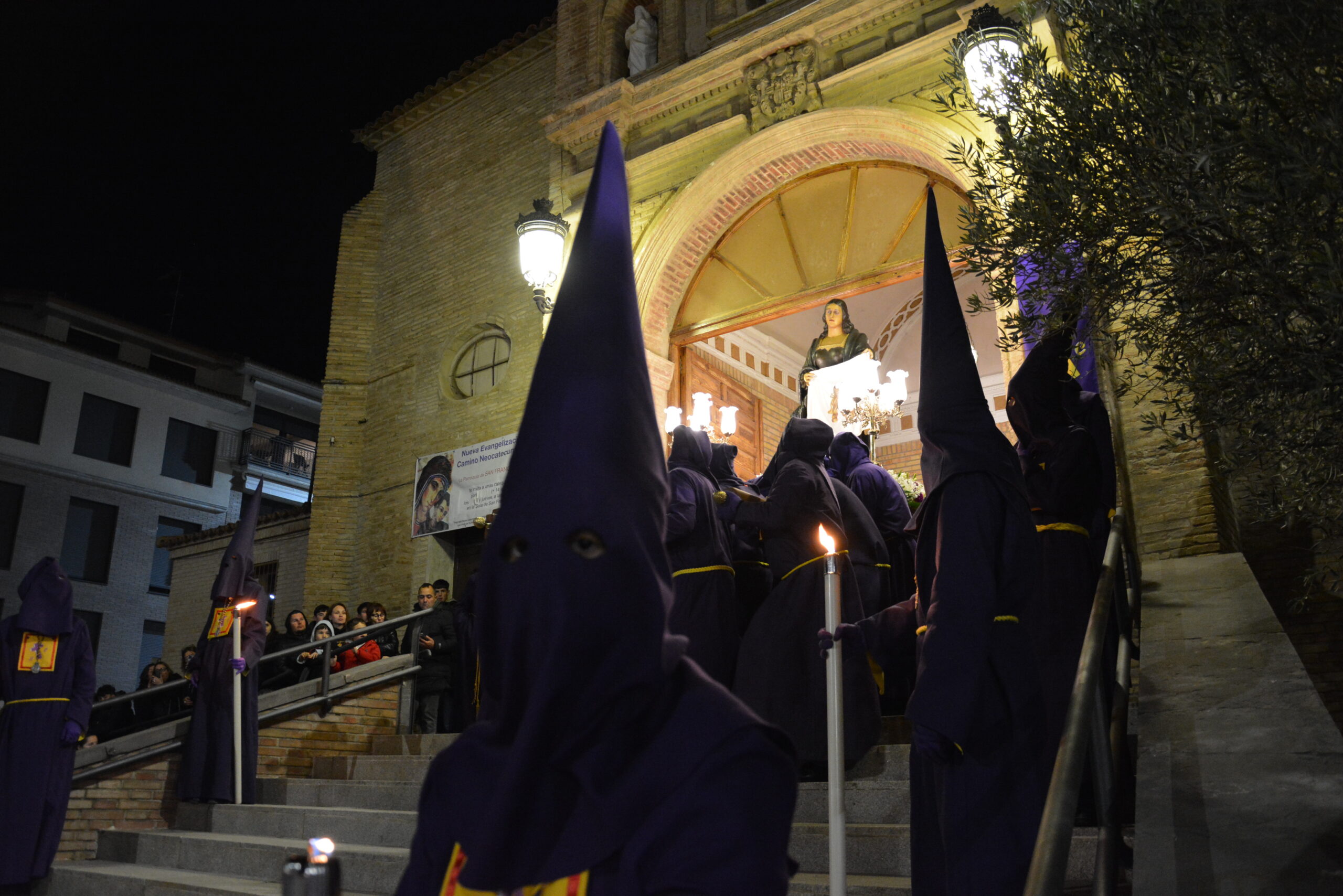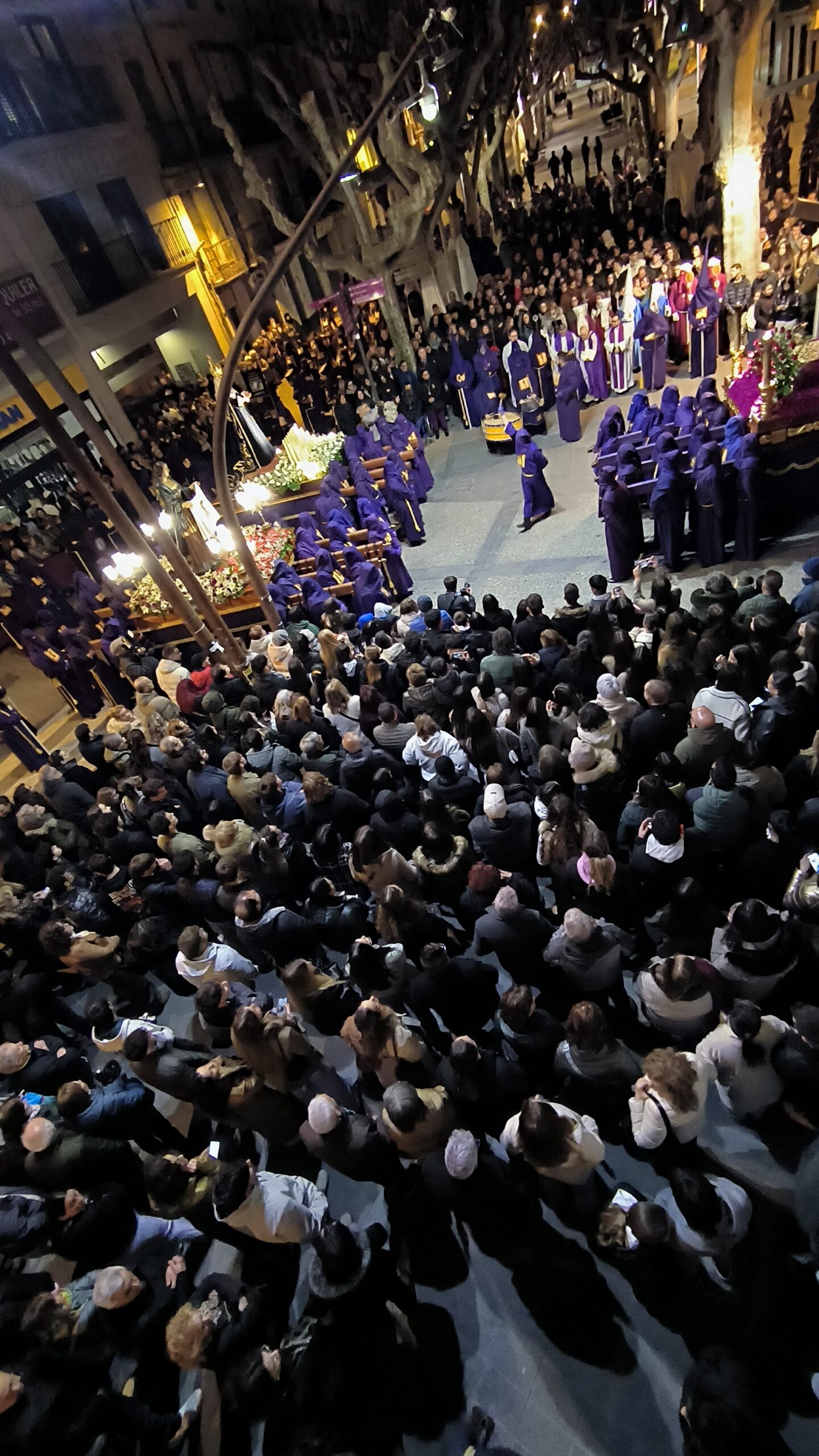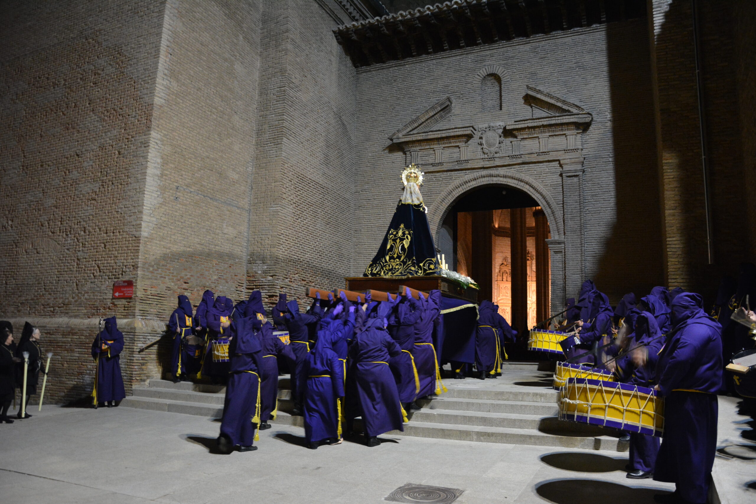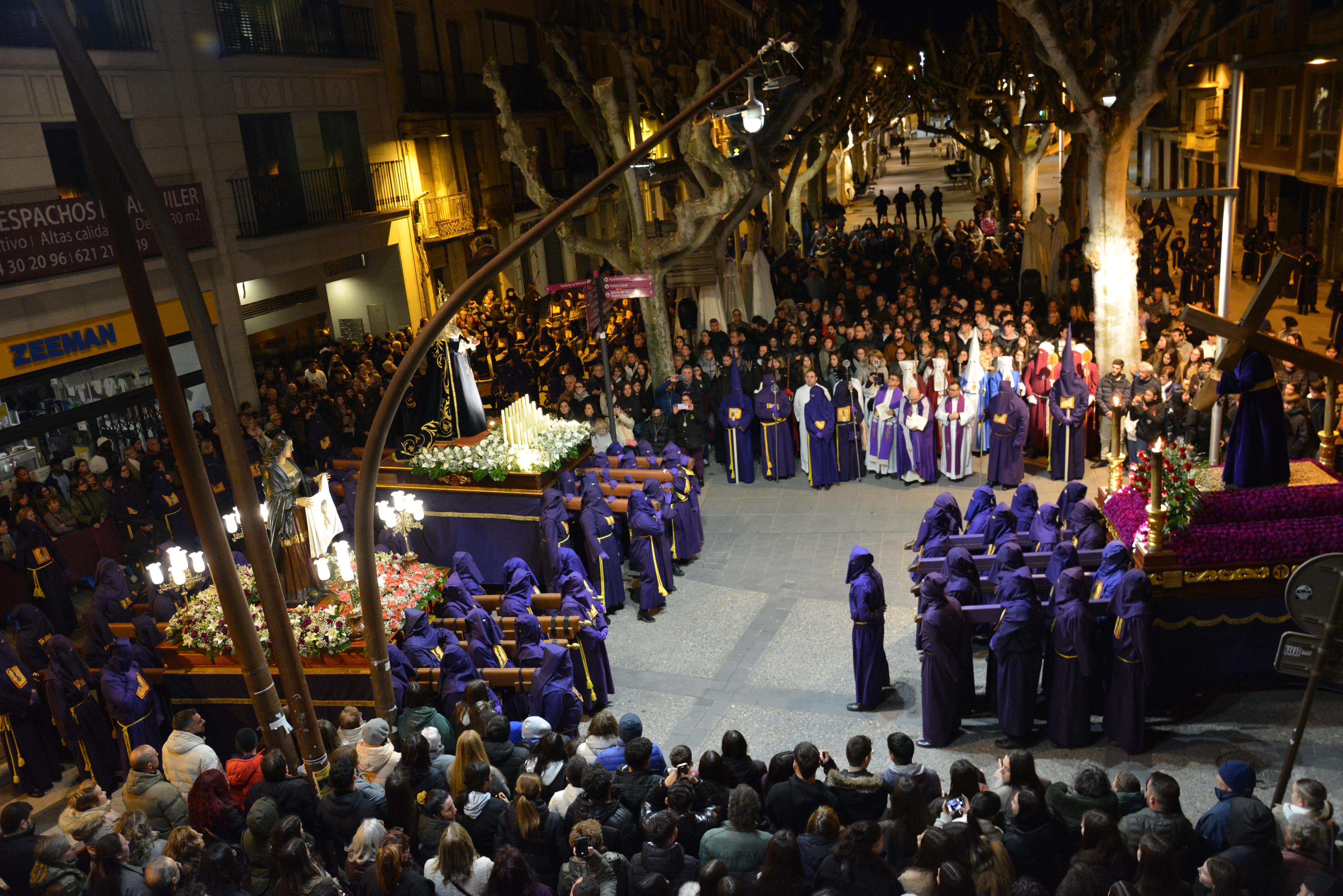 Allí, a la altura de Academia Cerbuna, se hace el silencio solo roto por el rimo de los tambores, testigos del encuentro entre el Hijo y su Madre que los portantes realzan haciendo bailar sus pasos. Tras el rezo de la cuarta y sexta estación del Viacrucis, José Luis Membrilla pone voz a una sentida jota, cuya letra resonó en el corazón de los presentes: «No hace falta ni el hablar, Madre e Hijo frente a frente. No hace falta ni el hablar, que en sus ojos hay consuelo y el dolor del caminar. Y el dolor del caminar, Madre e Hijo frente a frente.»