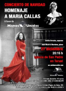 La delegación de Manos Unidas en Teruel celebrará un Concierto de Navidad, una cita solidaria que en esta edición rendirá homenaje a la legendaria soprano Maria Callas. El evento tendrá lugar el sábado 27 de diciembre a las ocho y cuarto de la tarde en la Iglesia de San Pedro, un espacio histórico que se llenará de música y solidaridad.