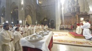 La catedral de Huesca ha acogido este miércoles 1 de abril, Miércoles Santo, la celebración de la Misa Crismal, presidida por el obispo de la diócesis, el padre Pedro Aguado Cuesta, y concelebrada por el presbiterio diocesano. En esta celebración, los presbíteros han renovado las promesas sacerdotales realizadas en el día de su ordenación. Asimismo, se han bendecido y consagrado los santos óleos: el crisma, el óleo de los enfermos y el de los catecúmenos.