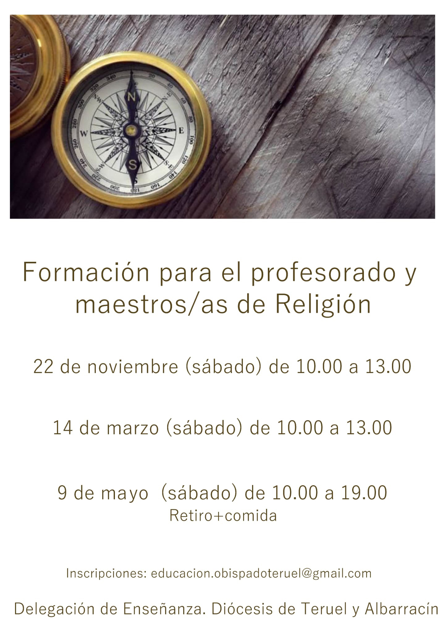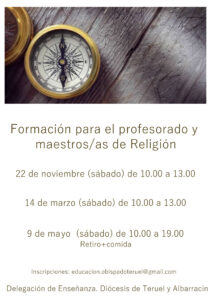 Como el año pasado, la Delegación de Enseñanza continuamos con nuestro plan de formación y crecimiento en la fe. Por ello hemos preparado unas nuevas jornadas de formación para el profesorado y maestros/as de Religión.