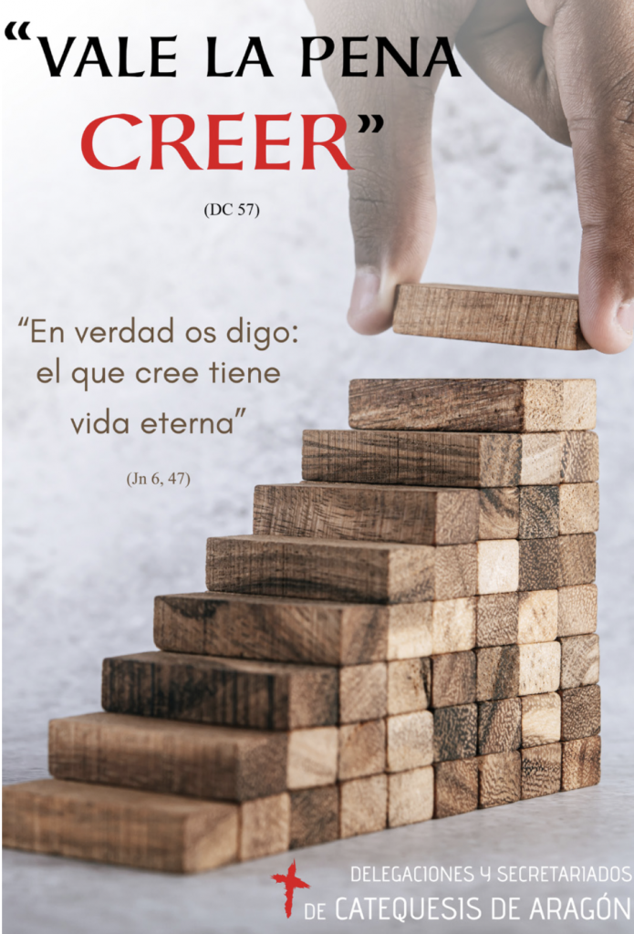 El cartel con el lema de este curso, “Vale la pena creer”, es una respuesta a la afirmación que Jesús hace en el evangelio de San Juan: “El que cree tiene vida eterna”, como recoge la carta de los obispos de este año a los catequistas con motivo del Día de la Educación en la fe. El objetivo pastoral de este año anima a impulsar la catequesis en este curso en el que aún sufrimos las consecuencias de la pandemia y, por ello, en las comunidades se han notado muchas ausencias, explican desde la Delegación de Catequesis de Zaragoza.