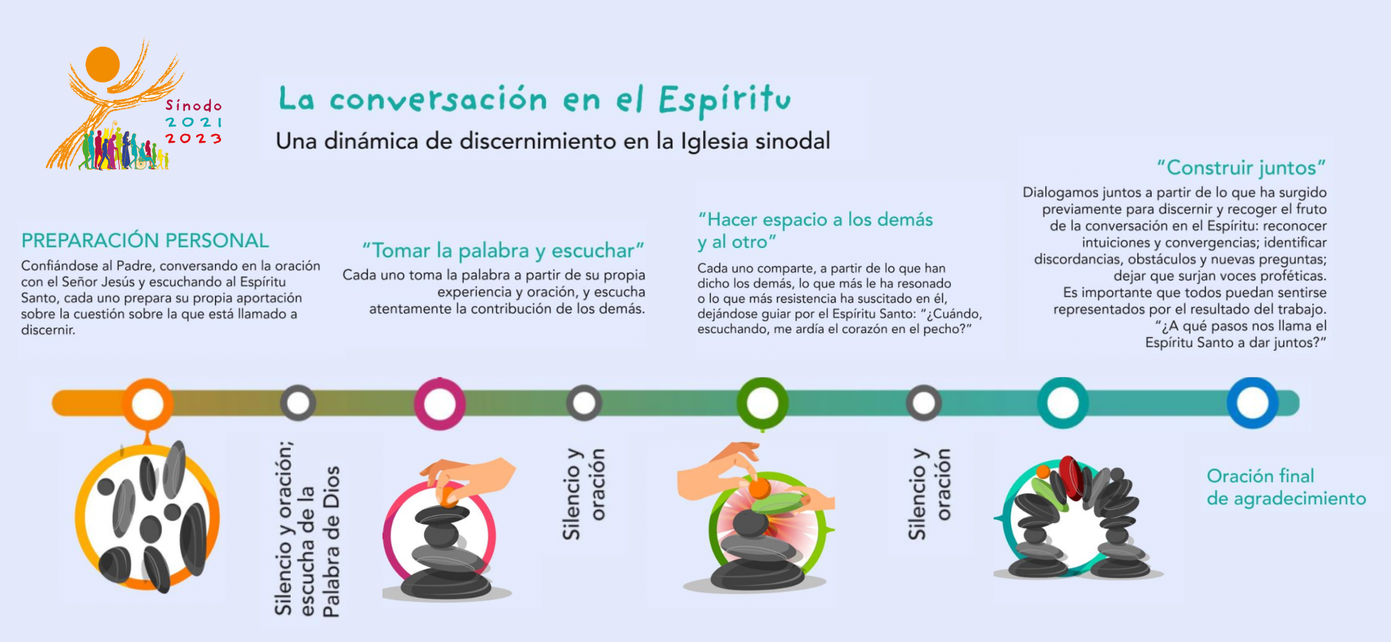El modo de abordar este trabajo, desde la Conversación en el Espíritu, nos conduce al conocimiento y la práctica del discernimiento comunitario y, así, a caminar hacia la conversión de las relaciones, los procesos y los vínculos, tal como propone el Documento Final del Sínodo, desde una verdadera espiritualidad sinodal.