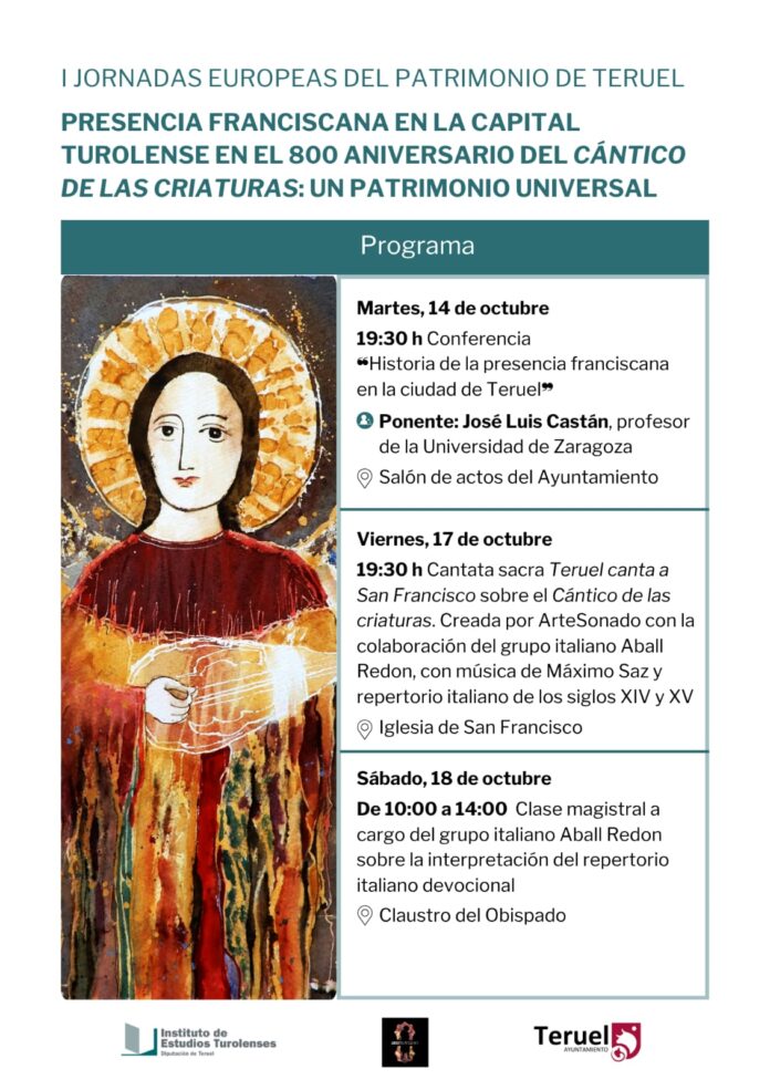 Con motivo del 800 aniversario del Cántico de las Criaturas de San Francisco de Asís, la capital turolense acogerá estas primeras Jornadas Europeas del Patrimonio, bajo el lema «Presencia franciscana en la capital turolense en el 800 aniversario del Cántico de las Criaturas: un patrimonio universal».
