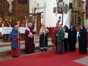 El sábado 7 de marzo recibimos con enorme alegría a nuestros amigos de Villarreal para celebrar juntos el Viacrucis Cuaresmal en Torrehermosa. Son ya quince años viniendo fielmente a nuestro pueblo para representar la Pasión y Muerte de Jesús, una tradición que sentimos muy nuestra. Habitualmente recorremos las calles de la localidad —las mismas que San Pascual caminó y disfrutó en su infancia—, pero este año, debido a la lluvia, vivimos la representación en el interior de la iglesia de Nuestra Señora de la Blanca, conocida por todos como la iglesia de San Pascual Bailón.