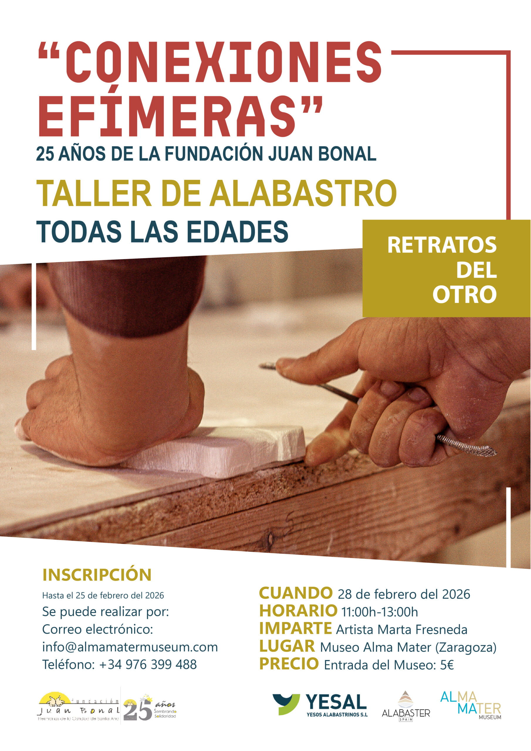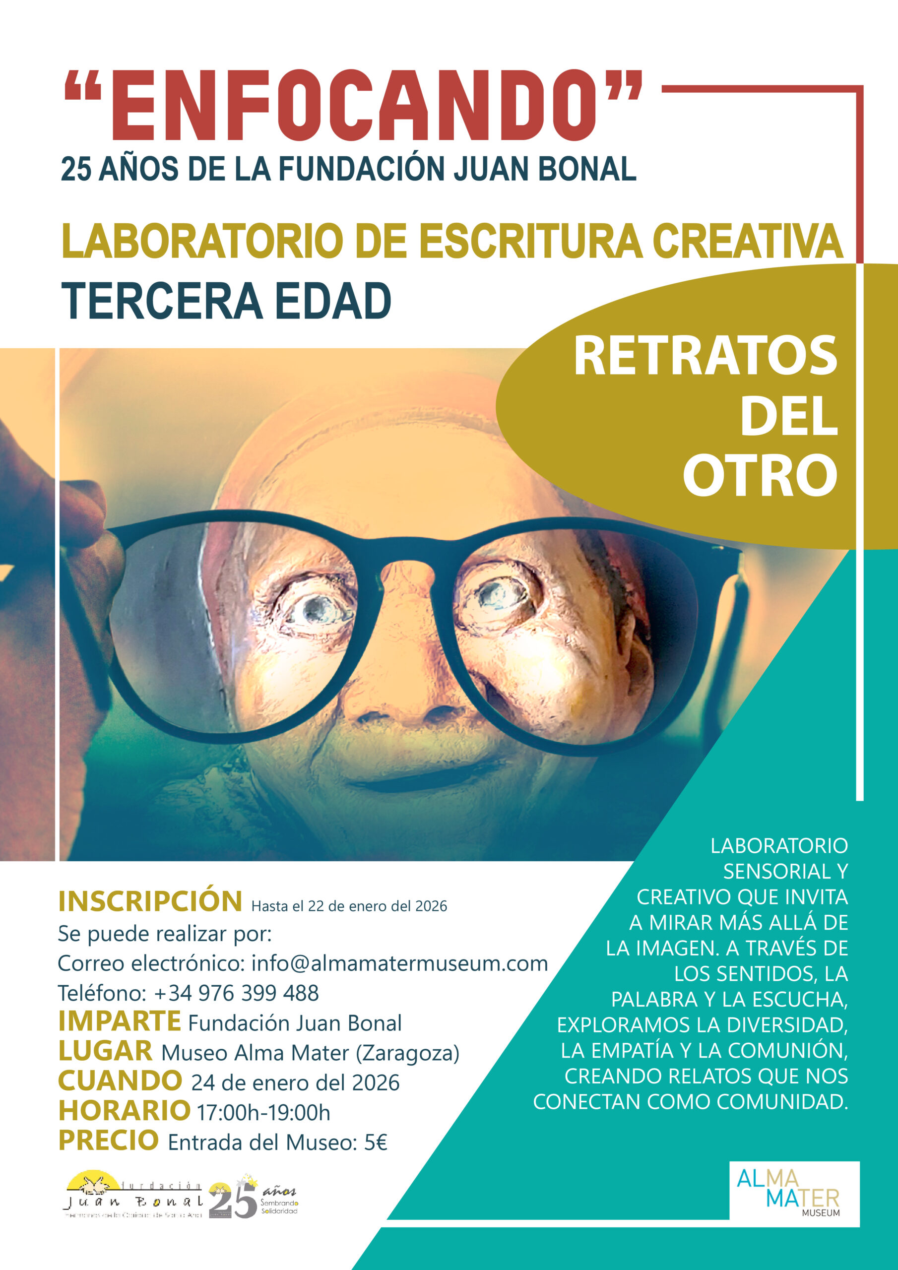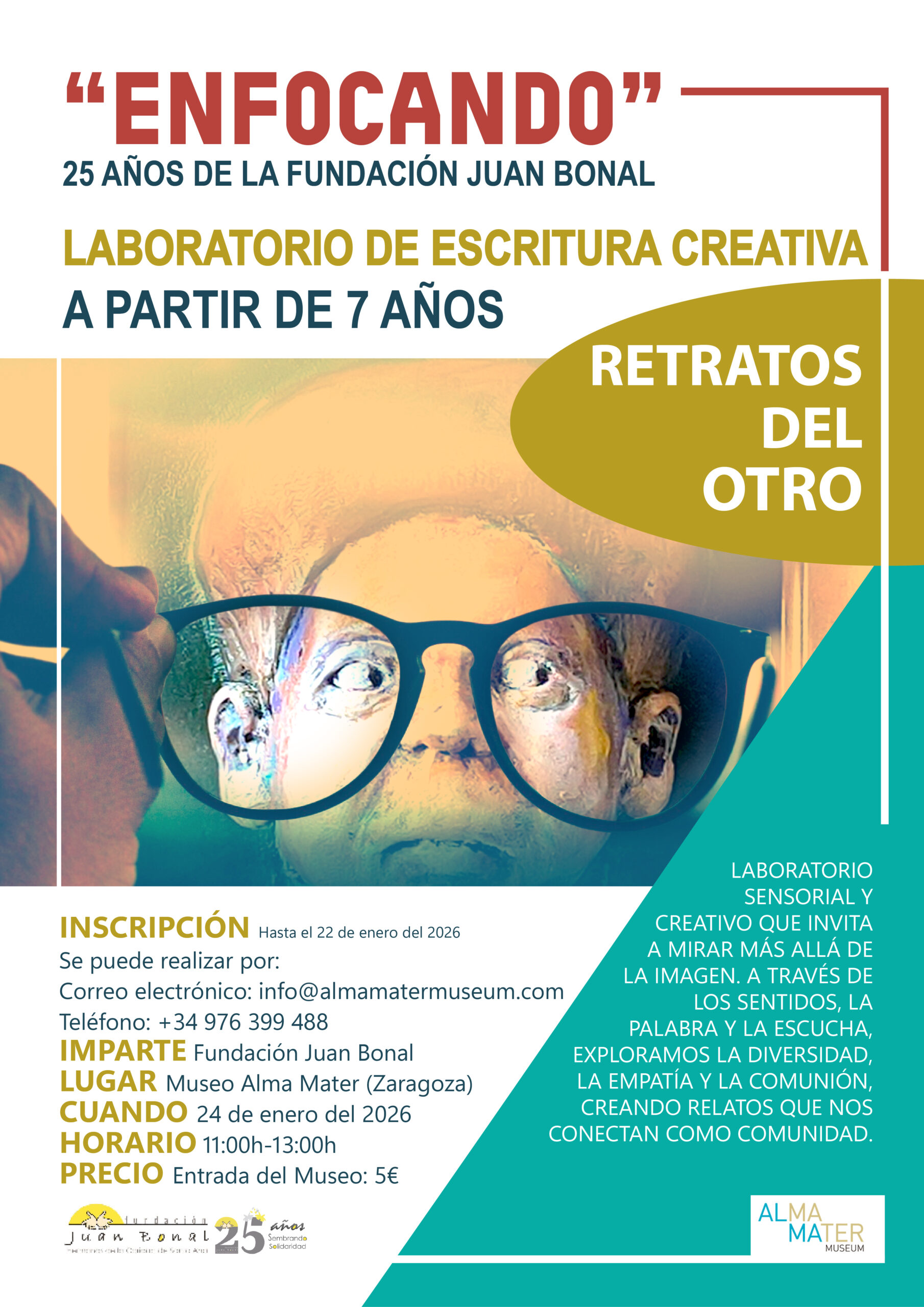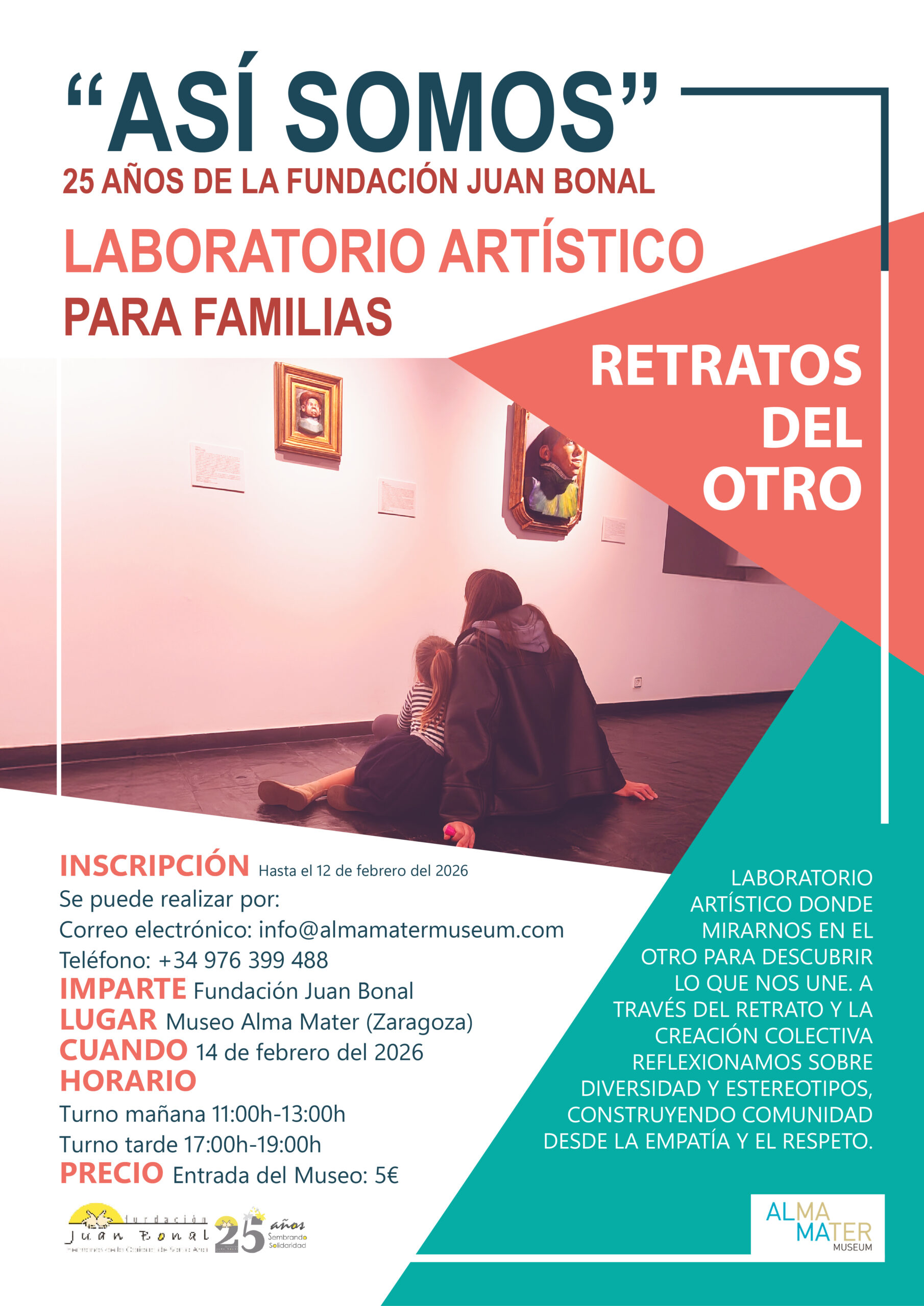 La vinculación de Retratos del Otro con el 25 aniversario de la Fundación Juan Bonal refuerza su dimensión social y comunitaria, alineando el discurso artístico con una trayectoria de compromiso, servicio y acompañamiento a personas en situación de vulnerabilidad. En el marco de la exposición y con motivo del 25 aniversario de la Fundación Juan Bonal, se desarrollará un programa de talleres y actividades participativas que amplían el discurso artístico hacia la experiencia comunitaria. Estas propuestas, dirigidas a públicos diversos, siendo el arte una herramienta de transformación social, encuentro, sensibilización y reflexión, fomentando valores como la acogida, el cuidado, la empatía y el reconocimiento del otro. A través de dinámicas creativas, escritura, trabajo con diferentes materiales y espacios de diálogo, la Fundación refuerza su compromiso histórico con la dignidad humana y la inclusión, celebrando sus veinticinco años de entrega y servicio desde una acción viva y transformadora.