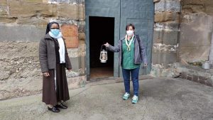 La pandemia no ha permitido hacer un reparto al uso pero, como las Trinitarias de Madrid la guardan todo el año, la capital de España ha sido el punto de partida para un recorrido adaptado a los cierres Provinciales y autonómicos. En Aragón, el movimiento Scout de Zaragoza recogió la llama en la frontera con La Rioja y el sábado pasado la pasaron a Huesca. Ese mismo día, se fueron sucediendo las entregas de manera personal en parroquias, congregaciones o el Hospital de Barbastro, de forma que estos puntos sean a la vez distribuidores, algo que ya ocurrió en esa jornada. Quien desee que esa luz arda en su hogar, puede dirigirse a su parroquia.