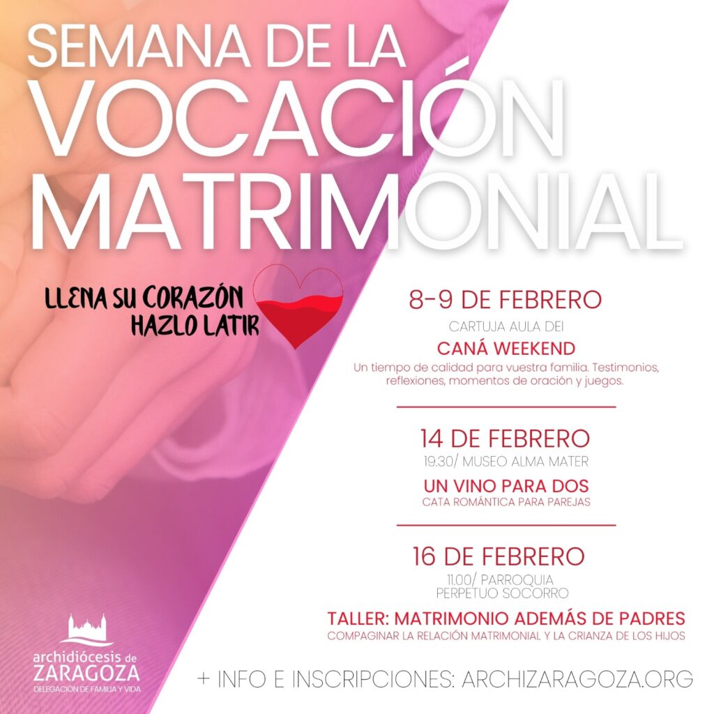 Taller «Matrimonio además de padres». Domingo, 16 de febrero, a las 11.00 h. en la parroquia Ntra. Sra del perpetuo socorro.Un taller en el que especialistas y matrimonios ofrecerán su testimonio de cómo han vivido las diferentes etapas de la vida matrimonial. El acto concluirá con una eucaristía a las 12.30 h.