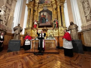 J.A.C.: La escultora Diana García Roy es una escultora abstracta. Pero al mismo tiempo, tiene una experiencia espiritual profunda, y entonces ha sabido combinar algunos rasgos, peculiares de la extracción, sobre todo las vestiduras de San José María, en la casulla, con, bueno, pues, la técnica del retrato, tanto a Santa Genoveva como a San José María, los hemos visto al menos en foto. Hay personas que se acuerdan de Santa Genoveva cuando pasaba, todos los días a las tres de la tarde. A mí me llama la atención lo que dijo José María Bordetas, capellán de la Virgen, y que, por supuesto, conoció a la Santa madre, ante mi pregunta, ¿qué le parece? Me dijo, es ella. Quizás es esto lo que hace que las dos esculturas se integren también en la capilla. Que encontramos rostros serenos, rostros cercanos, rostros que interpelan y también encontramos el gesto de las manos, llamada, acogida, algo tan humano como unas muletas, algo tan humano como unas gafas, en el caso de San José María. Y la pátina de un color bronce, dorado, marrón, pues hace que se integren perfectamente en el conjunto de la capilla. Es decir, hay rasgos de abstracción, pero también hay muchos rasgos de figuración y de retrato, imágenes para fomentar la devoción y la experiencia de fe.