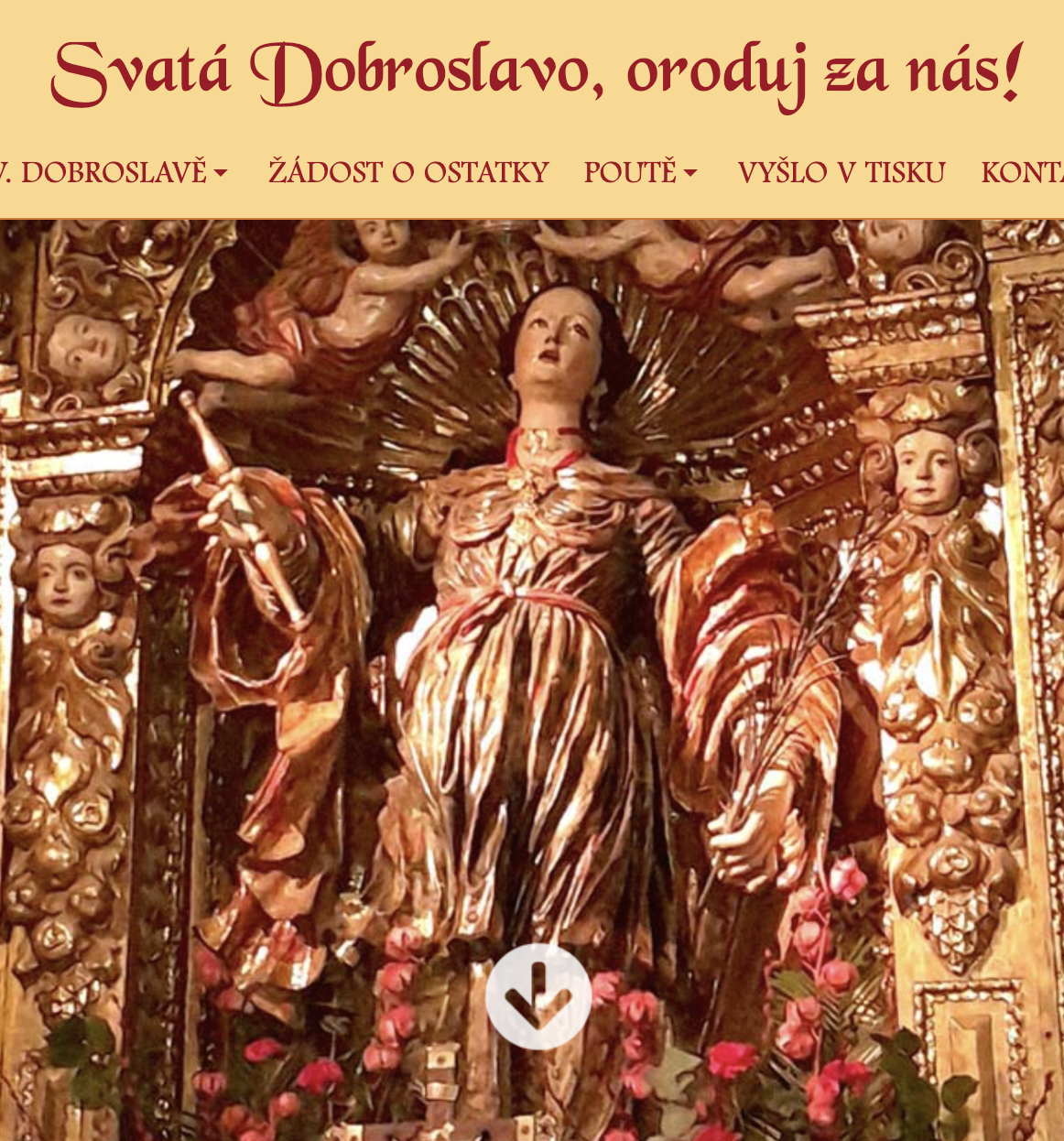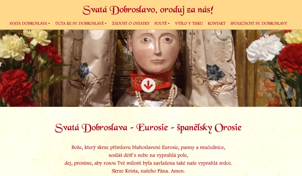 Uno de los primeros detalles que llama la atención al acceder a la web es la ausencia casi total del nombre español Orosia. En su lugar, se utiliza de forma sistemática el nombre Dobroslava, la traducción y adaptación checa tradicional, que es la que empieza a arraigar en la devoción popular local.