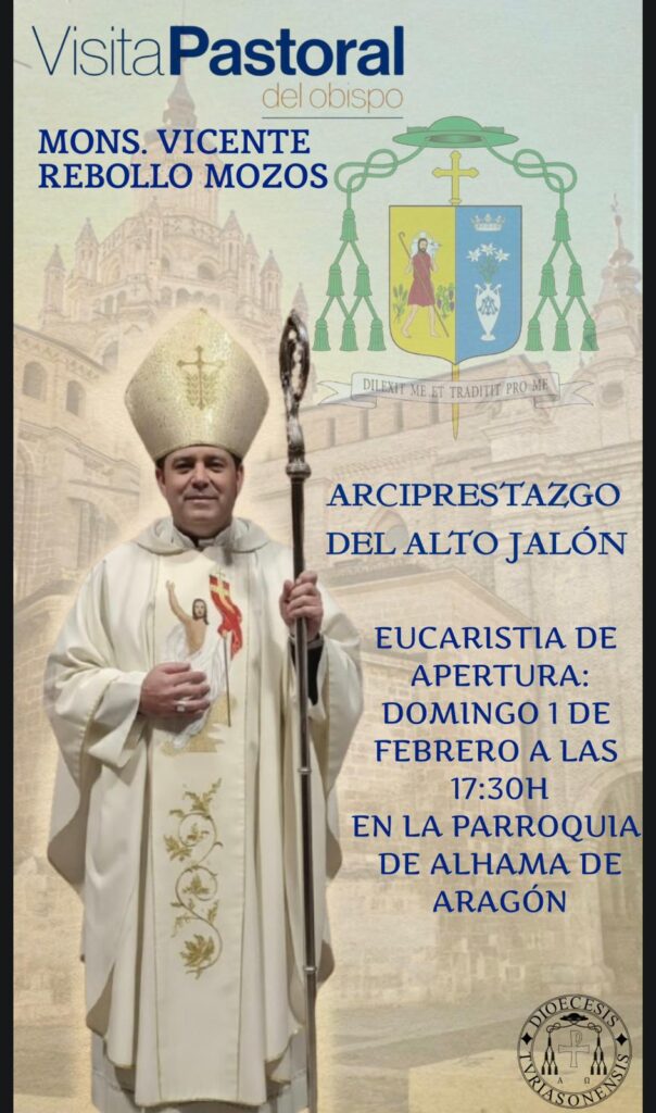 Nuestro obispo, Mons. Vicente Rebollo, comenzará el 1 de febrero, la visita pastoral al Arciprestazgo del Alto Jalón, que será la primera que realiza como obispo de la diócesis de Tarazona. Lo hará con una eucaristía de apertura a las 17.30 h en la parroquia de Alhama de Aragón.
