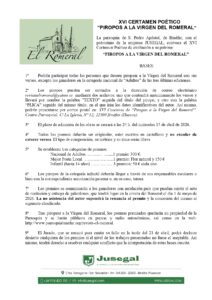 La parroquia de San Pedro Apóstol de Binéfar convoca el XVI Certamen Poético Piropos a la Virgen del Romeral, abierto a todos los participantes, excepto a los ganadores «Adultos» de las tres últimas ediciones. Todos los poemas deberán ser originales, estar escritos en castellano y no exceder de catorce versos.