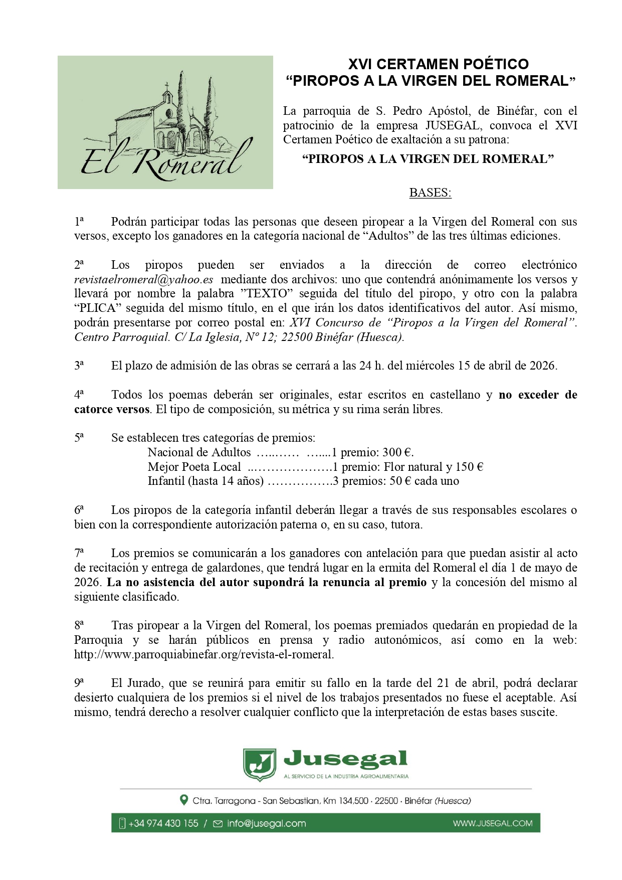 Las obras pueden enviarse por correo electrónico correo electrónico (revistaelromeral@yahoo.es) o postal (Centro Parroquial. C/ La Iglesia, n.º 12; 22500 Binéfar) hasta el 15 de abril de 2026.